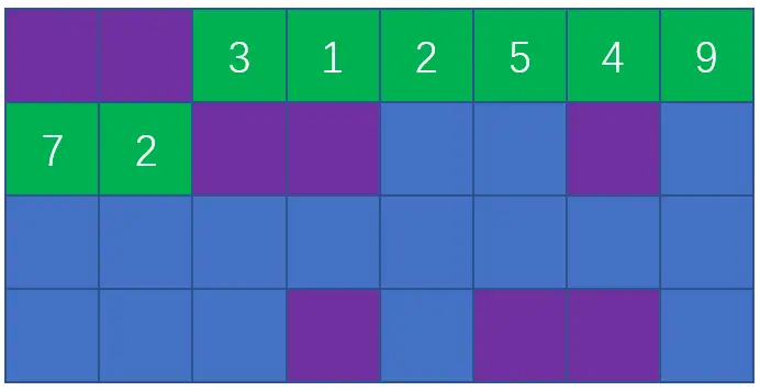 上面图中,蓝色的格子代表着空闲的存储单元,紫色的格子代表已占用的存储单元,而绿色的连续格子,代表着数组在内存中的位置。