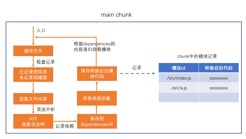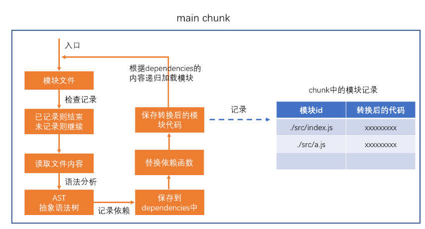 在第二步完成后,chunk中会产生一个模块列表,列表中包含了模块id和模块转换后的代码