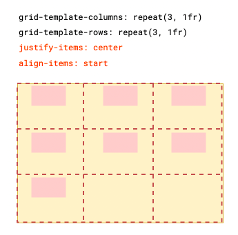 place-items: start center; /* 垂直靠上,水平居中 */