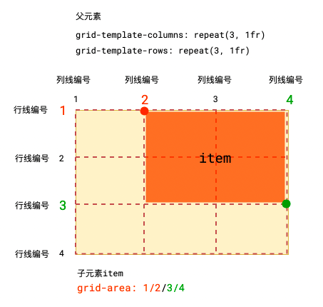 grid-area: 起始行线编号/起始列线编号/结束行线编号/结束列线编号;